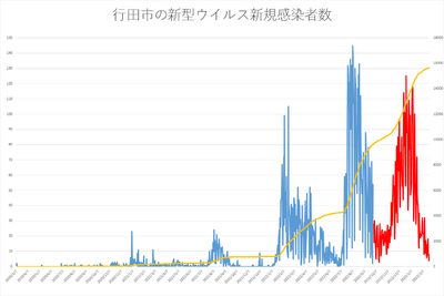 令和5年2月23日現在の行田市の新型コロナウイルス感染症の新規感染者のグラフです(R4.9.26以降は全数調査がなくなったため参考値)。昨夏や年末年始に比べ、新規感染者数がようやく減ってきました。終息までもう少しですね。元気に卒業式や修了式を迎えるために、引き続き感染症対策に十分ご配慮ください。自分の命は自分で守るしかありません。